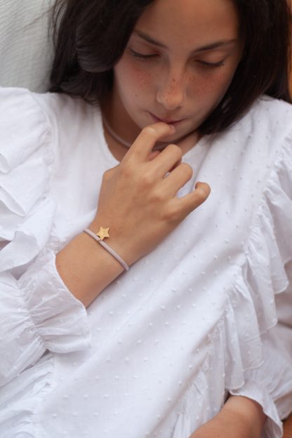 This initial star elastic bracelet consist on a star charm that you can engrave with an initial to be even more special. Is made of sterling silver and 3 microns gold plated, so it’s a jewel that will last in time. Not only for it quality, also because it has a meaning for the person who wears it. The initial  star elastic bracelet is the perfect gift for a girl on her birthday or communion day. The elastic cord makes it very comfortable to wear and also more secure anti-tug.