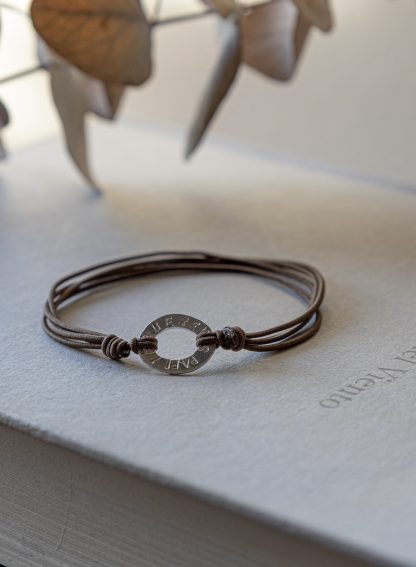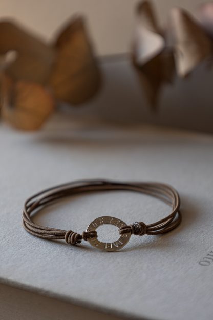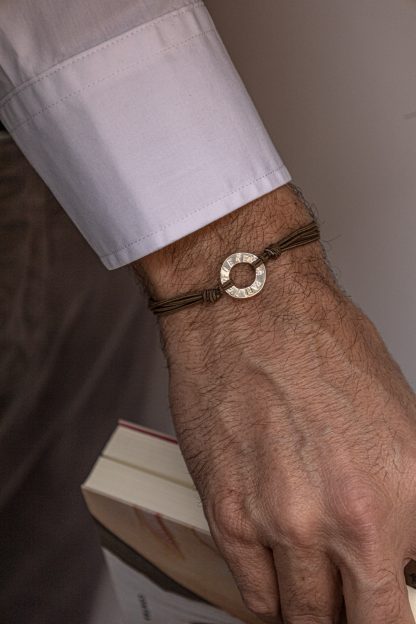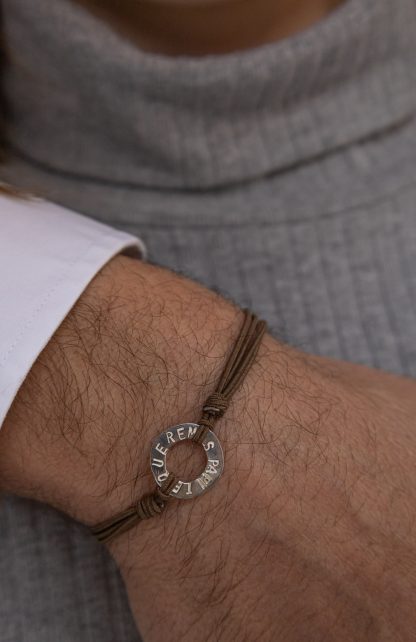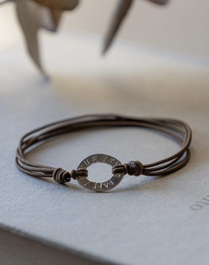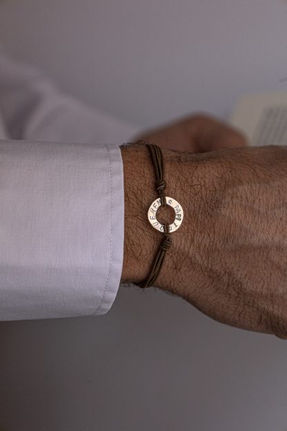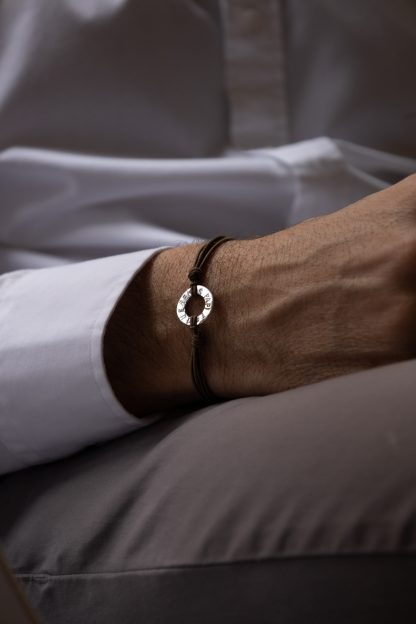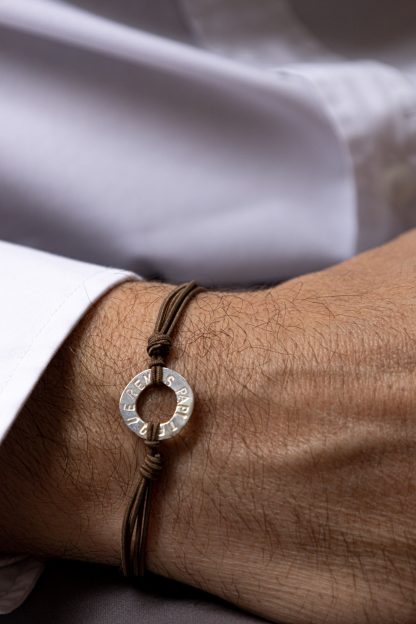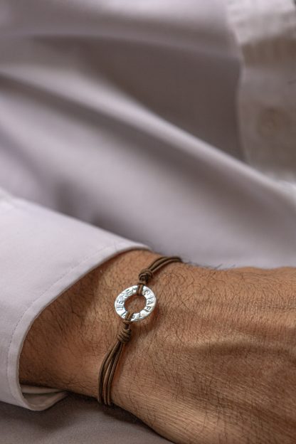 This nice men custom circle bracelet is made of 925 Sterling silver (so water resistant) and elastic and adjustable cord. Its hammered circle can be engraved with the names, message or dates you want. The text is hand stamped letter by letter and it looks really artisanal. And this is what makes it unique and really original. The men custom circle bracelet is a nice way to wear your kid name everyday. Also is very comfortable with its adjustable cord.