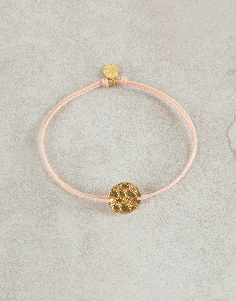 This textured initial medal string bracelet consist on a charm made with an artisanal technique, which I have convert a texture star kipur into a silver charm. And that makes it really nice and unique. You can also engrave an initial on the back side to be even more special. Is made of sterling silver and 3 microns gold plated, so it’s a jewel that will last in time. Not only for its quality, also because it has a meaning for the person who wears it. The textured initial medal string bracelet is the perfect gift for a girl on her birthday or communion day. Or for a new mom with her kids initial engraved on it.