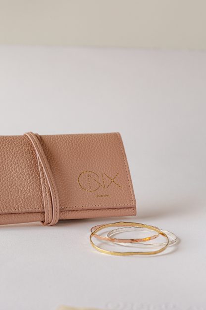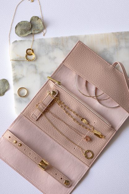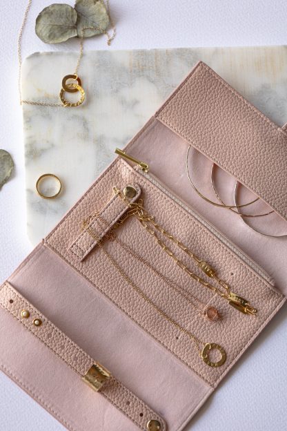 A beautiful and practical jewelry box to store and protect your jewelry when you go on a trip. Perfect for taking your jewelry on that weekend getaway or for your Christmas or Summer vacation. It has several departments for each type of jewelry: a pocket to store the smallest pieces; an area to hang the necklaces so they don’t get tangled; and a strip to place the rings so that they hold perfectly.