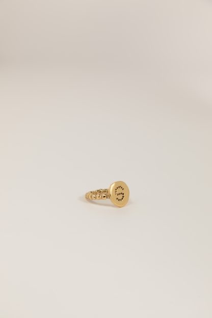 El Anillo inicial orgánico mediano es un anillo con un diseño muy diferente y original. Además ninguno es igual que otro ya que cada uno está hecho de manera artesanal. La medalla es ovalada pero irregular y le da un aspecto muy orgánico y único. Y el arito del anillo está compuesto por una linea de bolitas también con forma de redonda imperfecta e irregular.