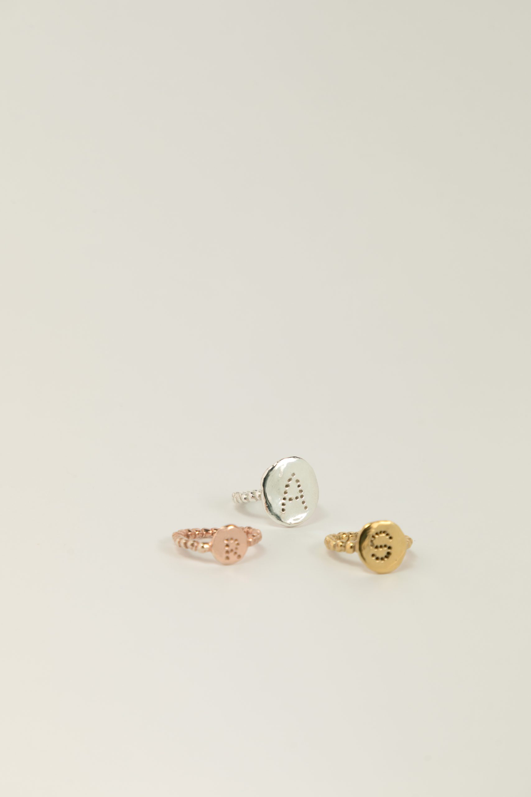 Todas nuestras joyas están confeccionadas con plata de 1ra ley con baños de oro de 18kt. También trabajamos con Oro 18kt, Oro blanco y Oro Rosa en piezas por encargo o en la colección “Wedding” de alianzas y anillos de pedida. Aunque todas nuestras joyas se pueden hacer en Oro 18kt. Nuestras piezas están hechas a medida con un diseño único y personalizable con el nombre, la inicial o mensaje que prefieras.