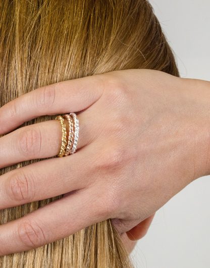 El anillo Familia con hilo cruzado, tiene un diseño muy fino y atemporal. Está compuesto por tres anillos que combinan tres acabados: plata, oro amarillo y oro rosa. Tres anillos inseparables que simbolizan vuestra pareja junto con la llegada de vuestro ser más querido. Tres anillos que puedes llevar todos en un mismo dedo, o en diferentes dedos para conseguir un look muy actual.