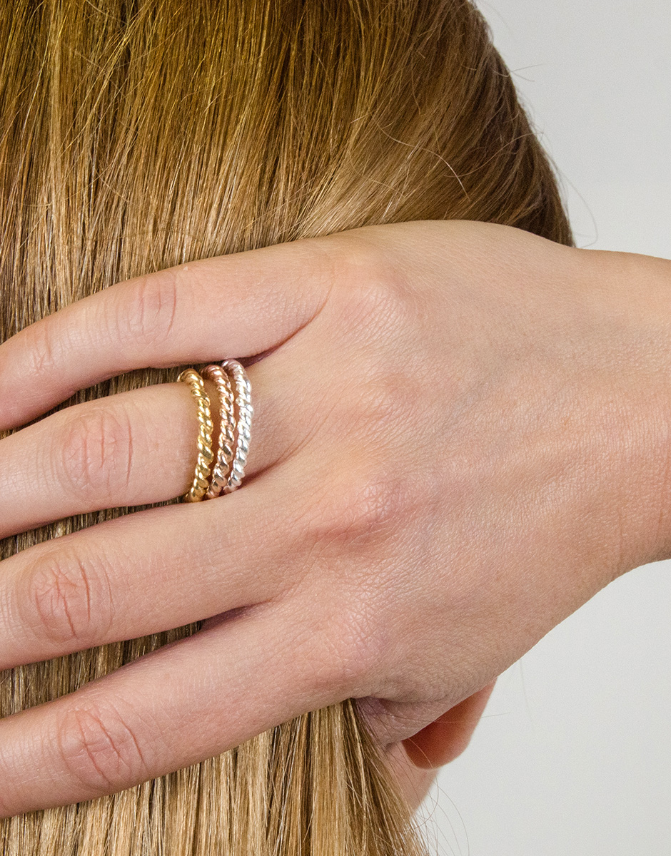 El anillo familia está compuesto por tres anillos con hilo cruzado: uno en plata, otro con baño de oro amarillo y el tercero con baño de oro rosa. Tres anillos inseparables que simbolizan vuestra pareja junto con la llegada de vuestro ser más querido. Tres anillos que puedes llevar todos en un mismo dedo, o en diferentes dedos para conseguir un look muy actual.
