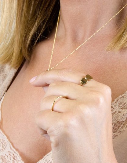 Anillo con dos piezas ovaladas soldadas entre sí. Se pueden personalizar (o no) con dos iniciales y queda muy fino y discreto. Muy cómodo para llevar a diario.