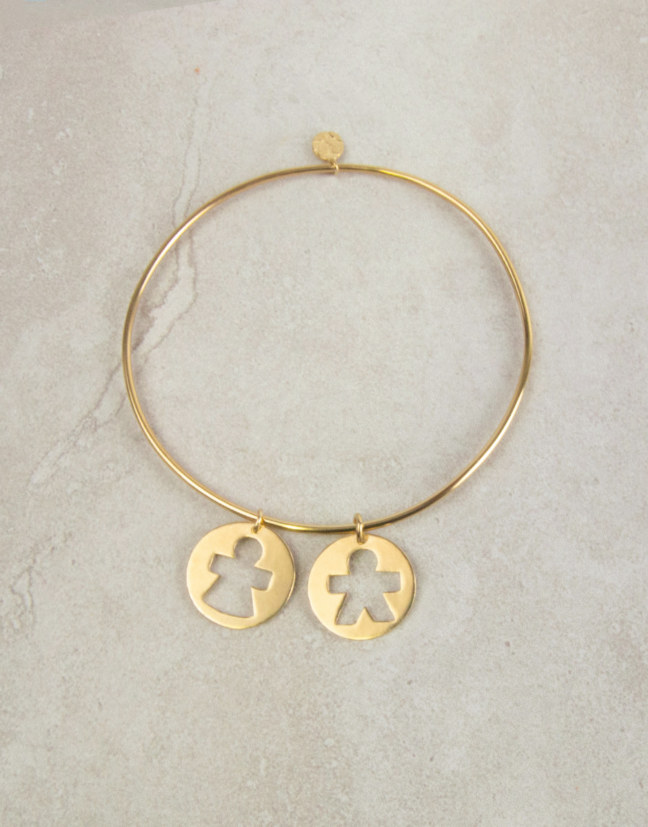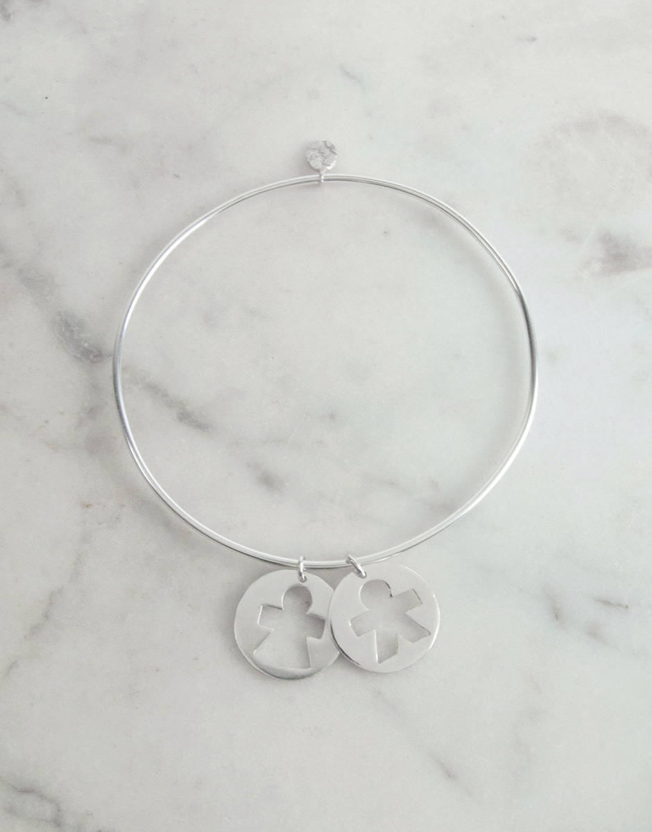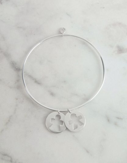Brazalete con colgante en forma de medalla con niño o niña calados. Puedes combinar los colgantes como quieras y elegir su acabado. Perfecta y elegante para llevarla sola en tu día a día o para combinarla con otras pulseras.