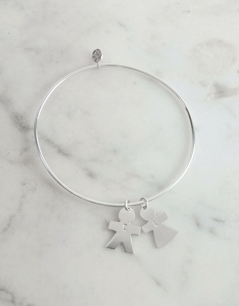 Brazalete con colgante en forma de niño o niña personalizables con inicial. Puedes combinar los colgantes como quieras y elegir su acabado. ¡Una joya elegante y que a la vez representa tanto sentimiento!