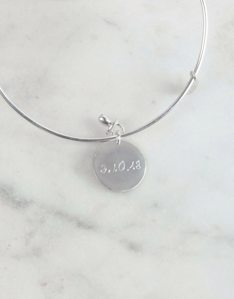 El brazalete personalizado Recién Nacido es una joya perfecta para regalar (o auto regalarse) en el nacimiento de ese bebé tan esperado. Consta de una medalla redonda, que puedes personalizar con el nombre que desees en el frontal y la fecha de nacimineto en el reverso. Y un “charm” en forma de mini chupete. Un detalle muy tierno que recuerda la llegada de ese ser querido. Una joya que te acompaña siempre y te recuerda en todo momento el amor que sientes por los tuyos.