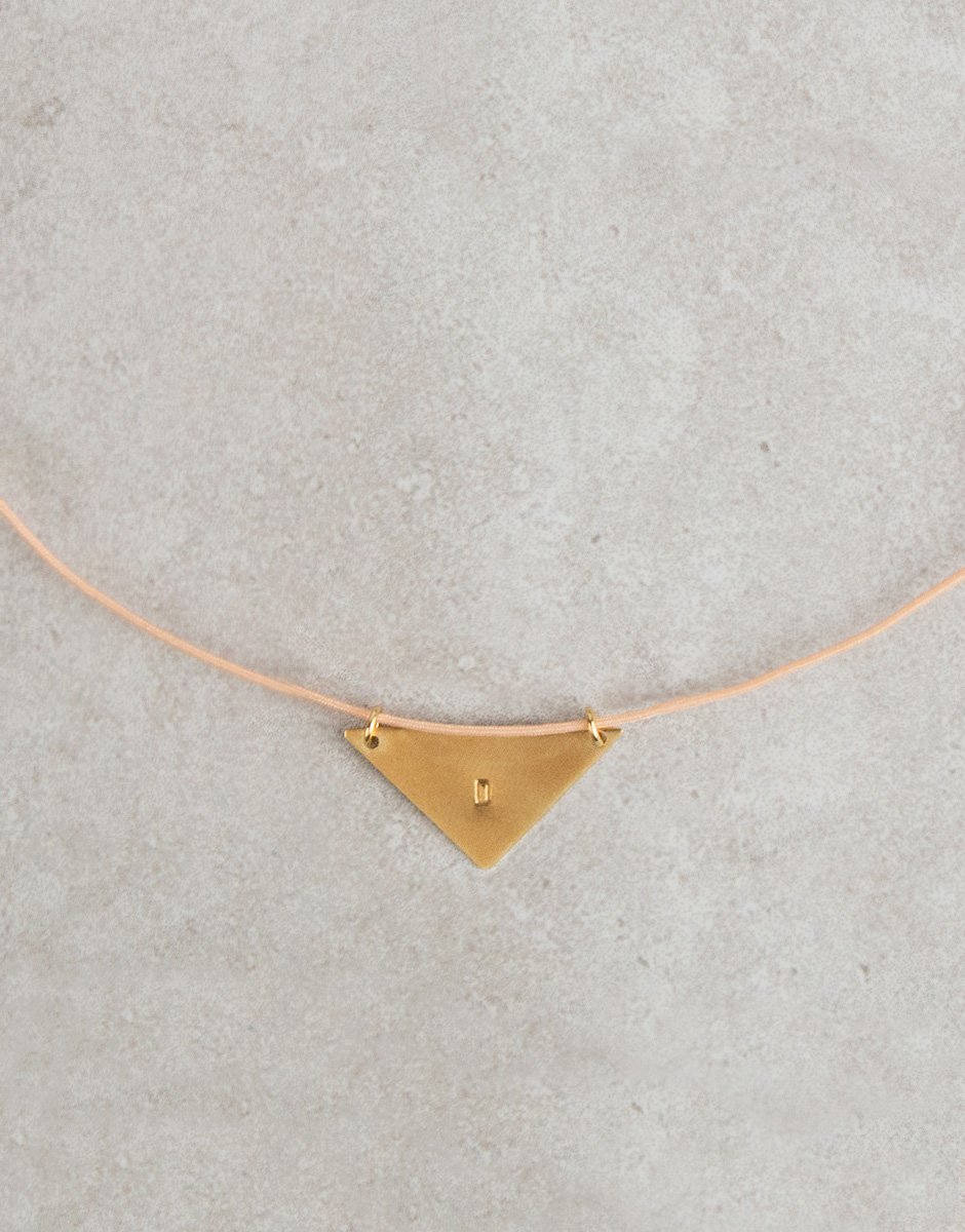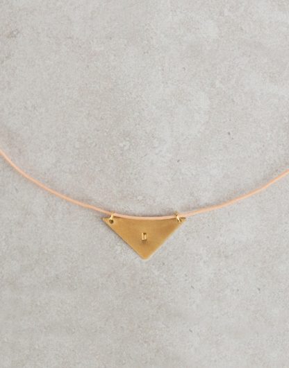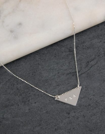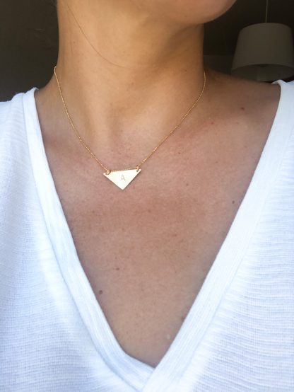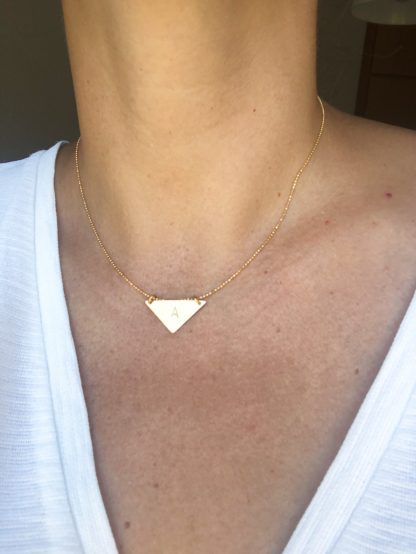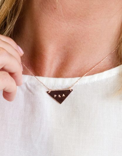 Collar con triángulo personalizable con un nombre o varias iniciales. Es un collar con un diseño actual y a la vez atemporal. La pieza triangular va cogida a la cadena con dos anillas en la parte superior, lo que le da un punto diferente. ¡Una joya personalizada diferente y muy fresca!