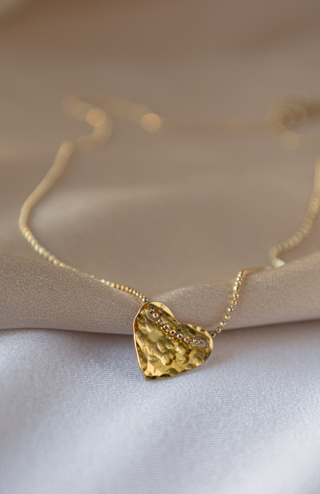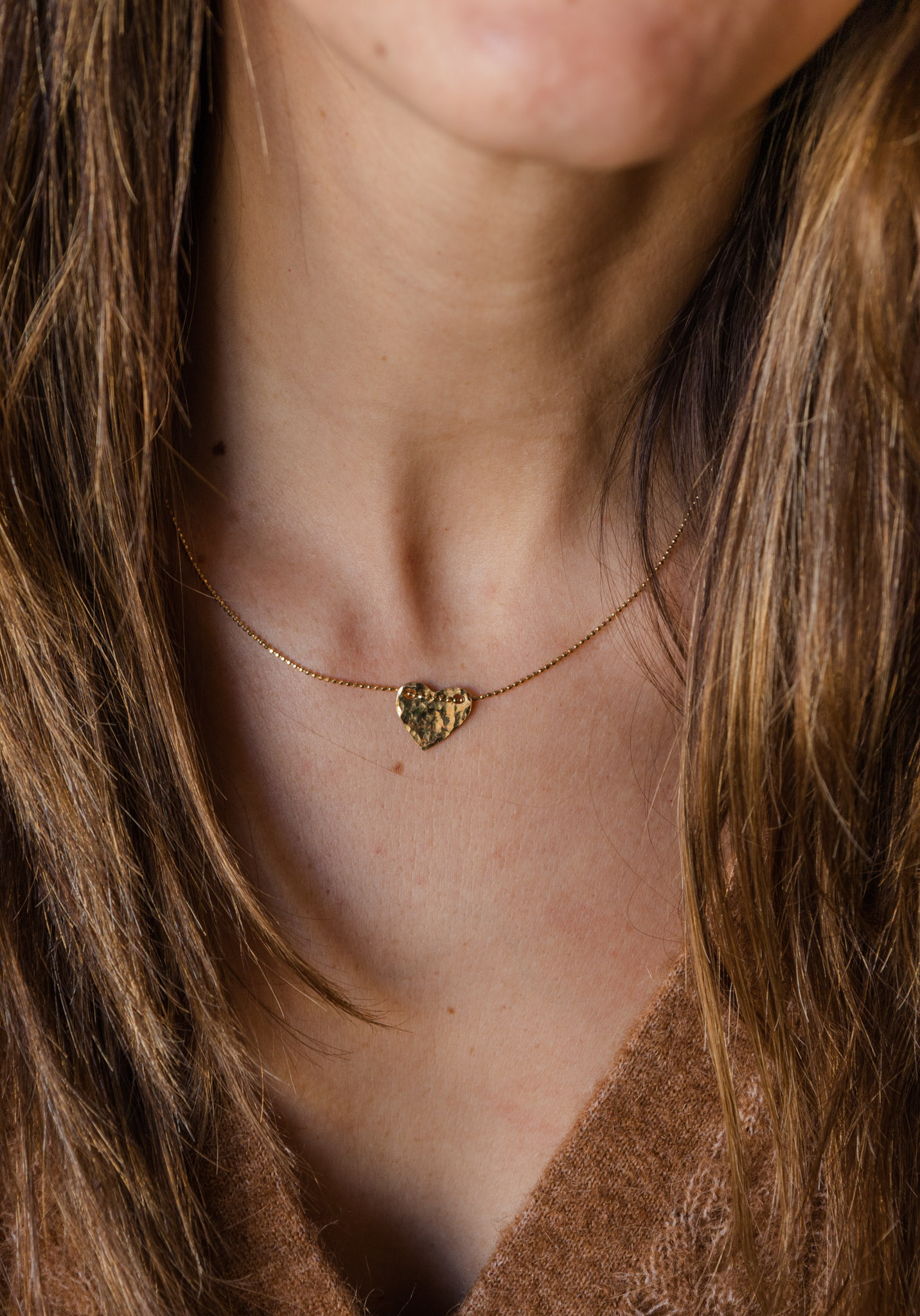 El Collar Corazón Martelé con grabado, es joya que simboliza el amor y afecto que sientes por esa persona. Es un corazón muy especial, no solo por su diseño con efecto Martelé que le da ese aspecto irregular y artesanal que lo hace único y diferente del resto de Charms corazón convencionales. Sino también porque puedes personalizarlo con un grabado en el reverso. Puedes grabar de 1 a 3 iniciales. Está hecho a mano en nuestro taller, con plata de 1ra ley y baño de Oro de 18kt de 3 micras. Un colgante muy elegante y fino para llevar siempre puesto, y combinarlo con otros collares.