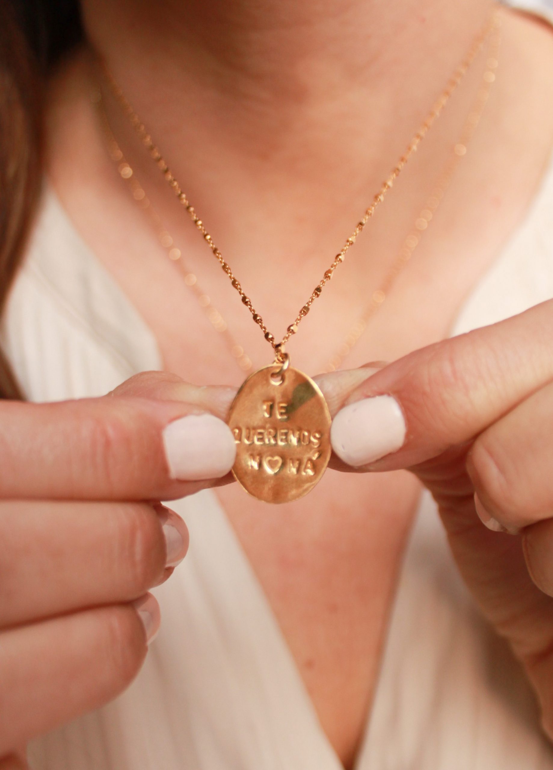 Nuestras joyas son personalizables para que sean únicas para quien las lleva. El grabado es en Mayúsculas y es un grabado con punzones que hace un efecto com de escritura en mecanografía. Los grabados se hacen a mano en nuestro taller de manera personalizada.