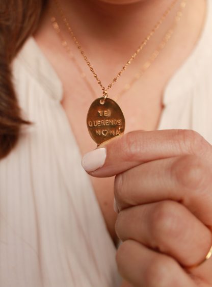 El collar Mamá Ovalado con Textura personalizado en el reverso, es un collar muy elegante y único que puedes personalizar con el mensaje que tú desees:  Te queremos Mamá u otro mensaje, nombre o frase especial que quieras. Es un diseño único que hacemos en nuestro taller a través de una técnica artesanal para conseguir esa textura inigualable. Una joya que le acompañará siempre y le recordará en todo momento el amor que sientes por los tuyos.