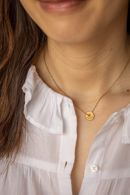 Nuestras joyas son personalizables para que sean únicas para quien las lleva. El grabado es en Mayúsculas y es un grabado con punzones que hace un efecto com de escritura en mecanografía. Los grabados se hacen a mano en nuestro taller de manera personalizada.