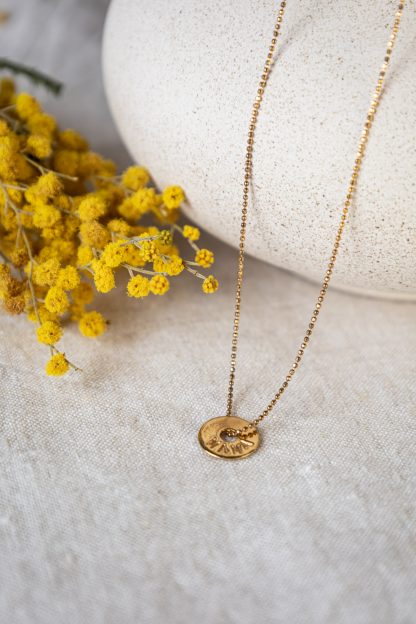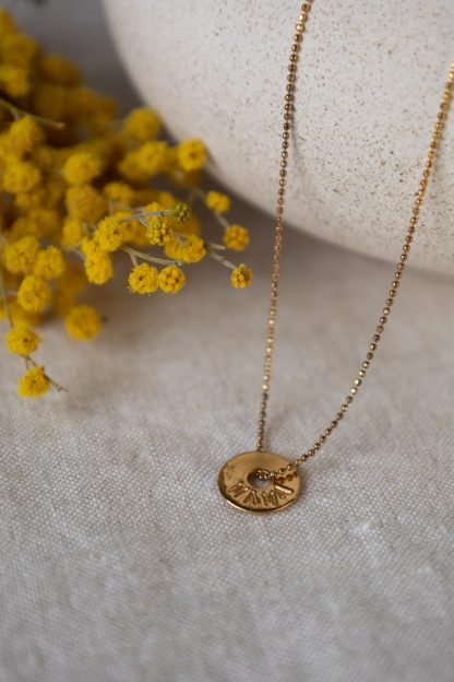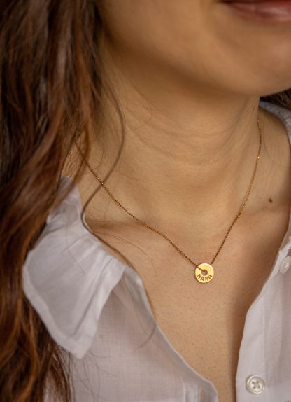 Collar personalizado con Aro Pequeño Mama, es un collar que te recuerda el amor que los tuyos sienten por ti. Tiene un diseño minimal y un grabado muy sutil. Puedes grabar la palabra MAMA, o hasta 4 caracteres-iniciales. Un collar muy elegante y muy cómodo de llevar.