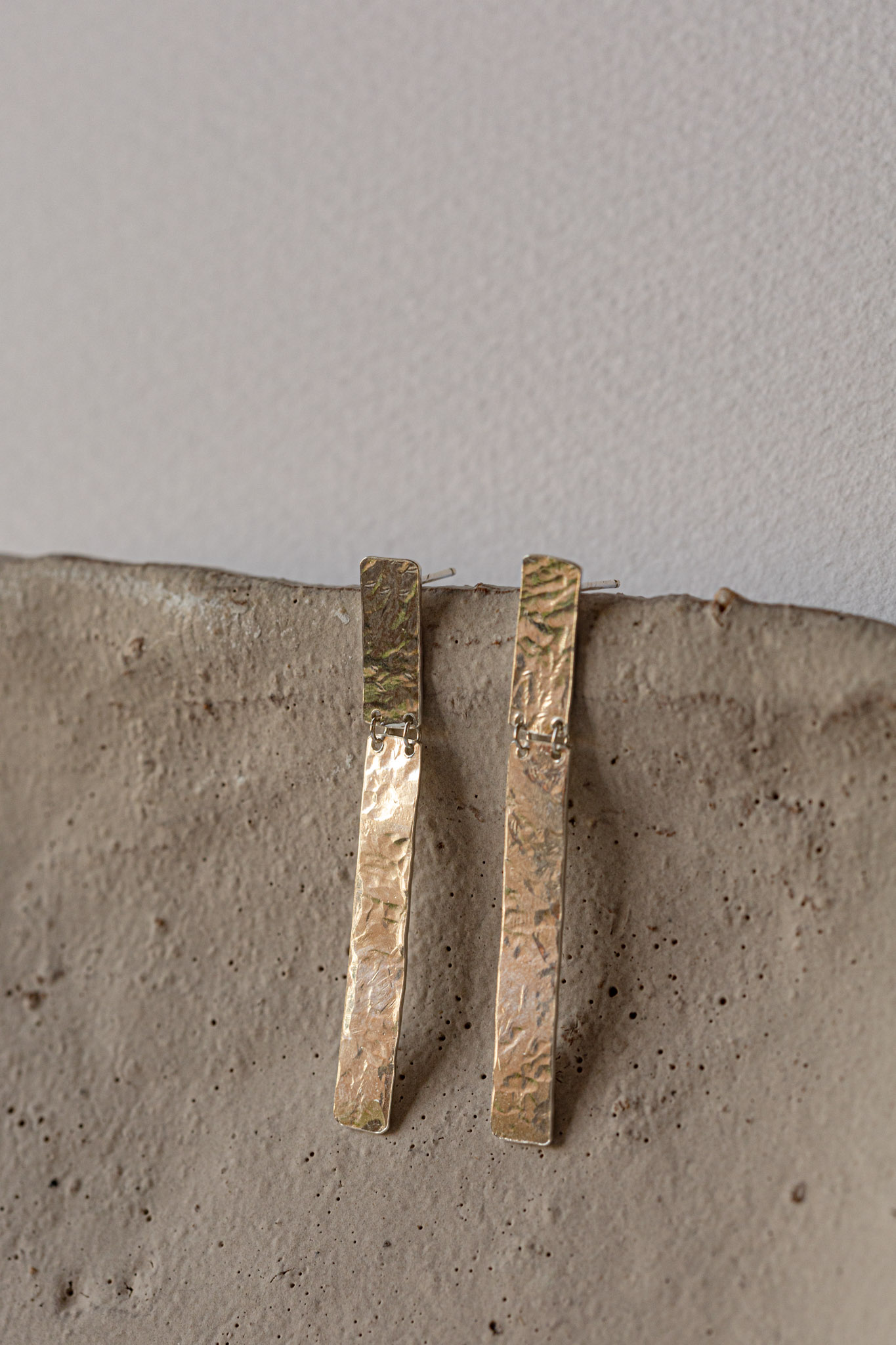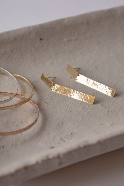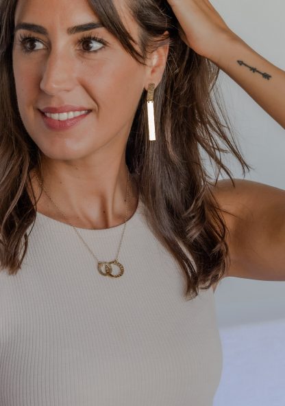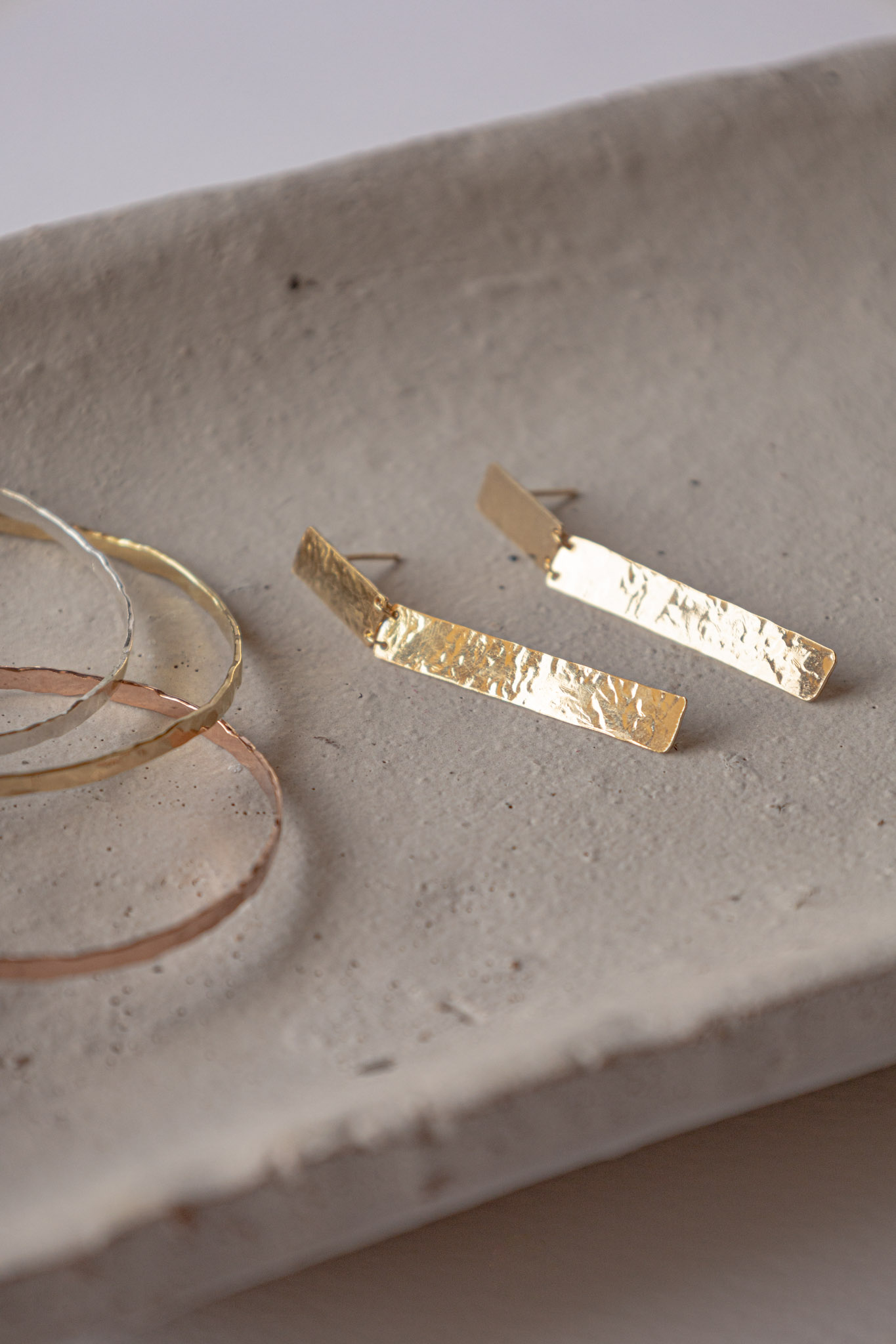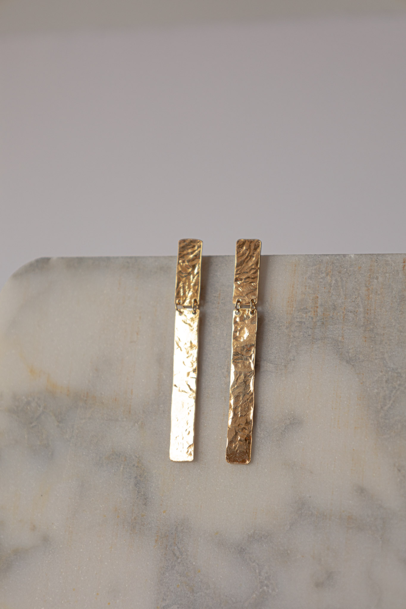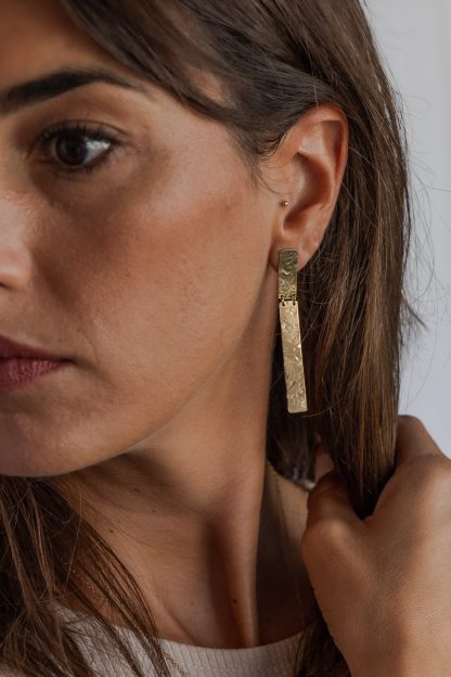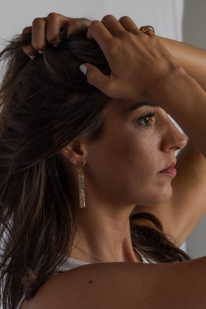 Los pendientes Line Martelé, son unos pendientes que estilizan mucho el rostro por su forma vertical y por el reflejo que hace su textura Martelé. Su diseño hace que el pendiente se mueva ligeramente y eso favorece una barbaridad. Un básico perfecto que no te quitarás nunca porque son muy cómodos, no pesan nada, y combinan con todo.