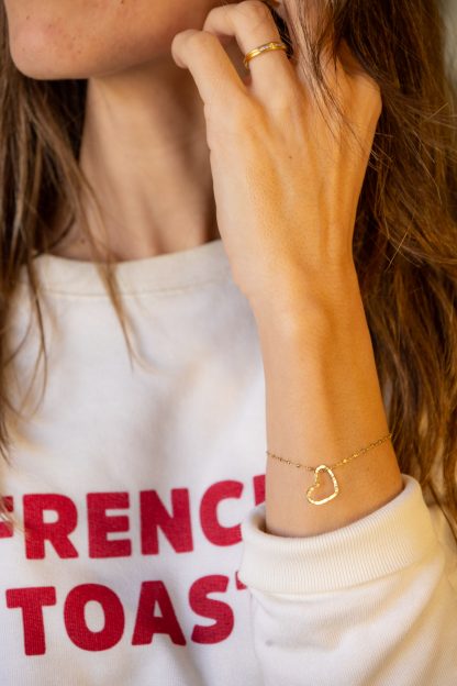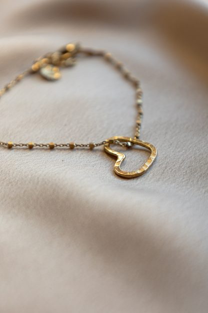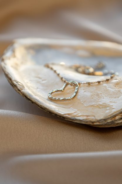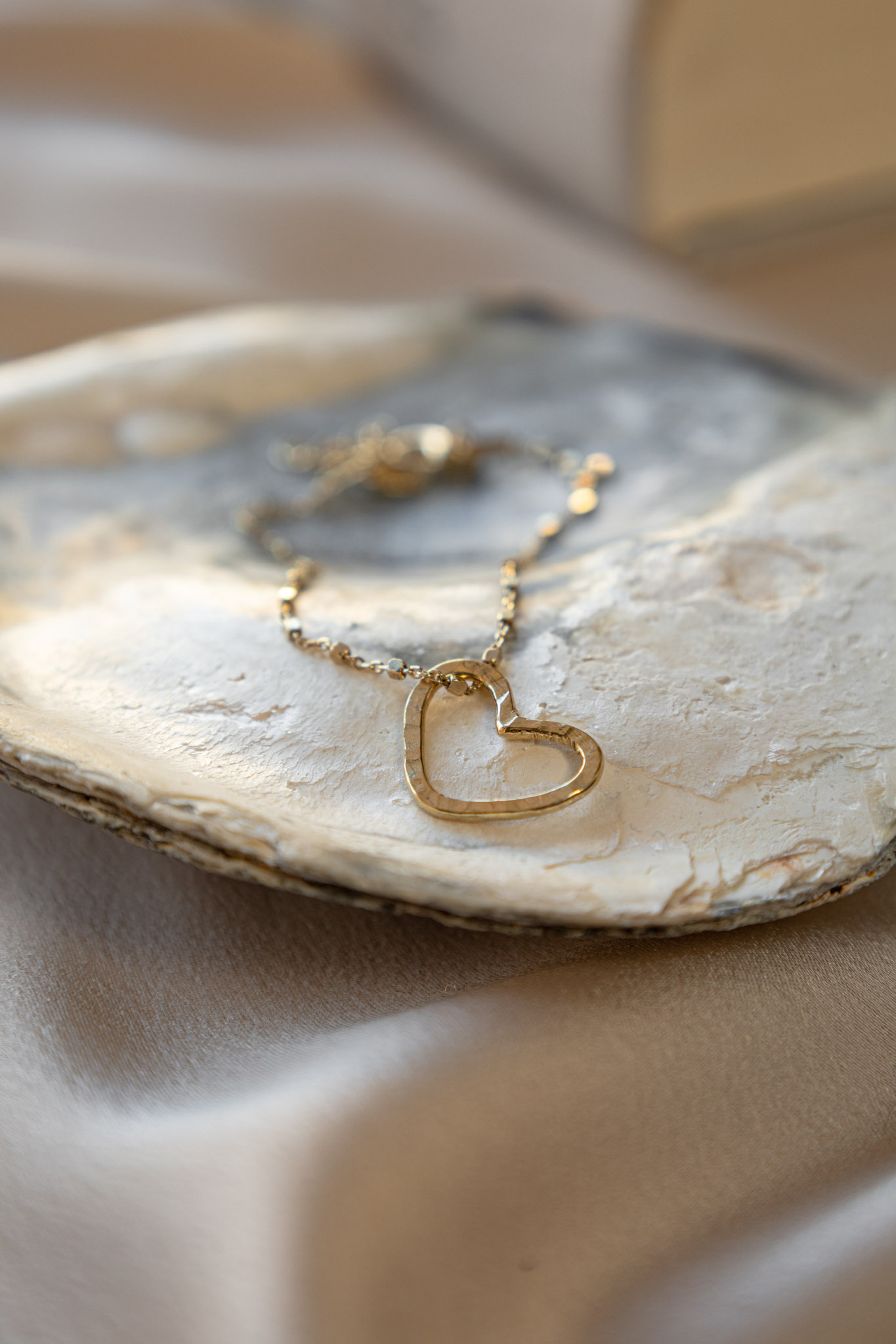 La Pulsera Corazón aro con cadena, es el regalo perfecto para esa persona tan importante en tu vida.  Una pulsera con un charm que lo dice todo por sí solo. Un corazón único por su forma tipo aro, y por su efecto Martelé que le da ese aspecto irregular y artesanal que lo hace diferente del resto de corazones convencionales. Está hecho a mano en nuestro taller, con plata de 1ra ley y baño de Oro de 18kt de 3 micras.  .