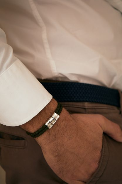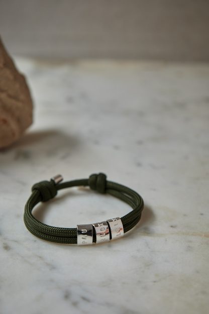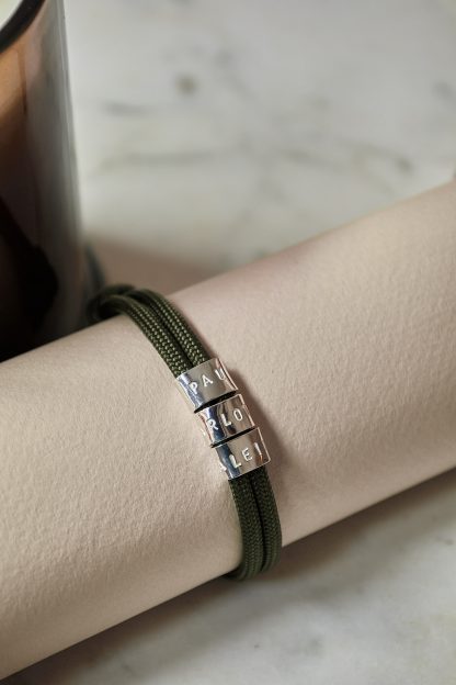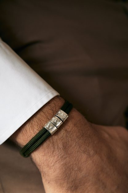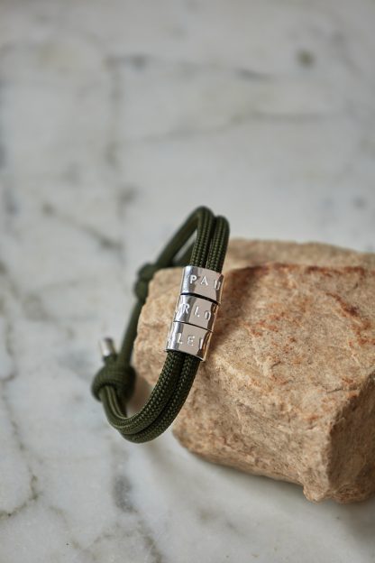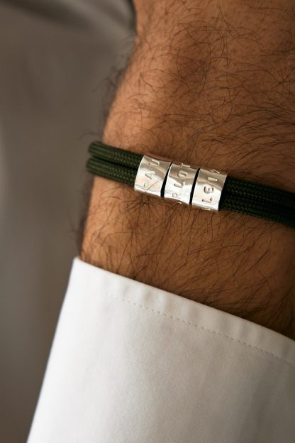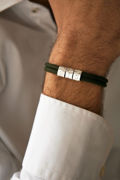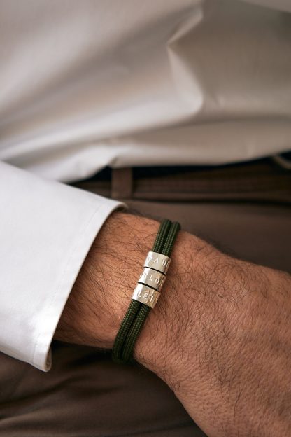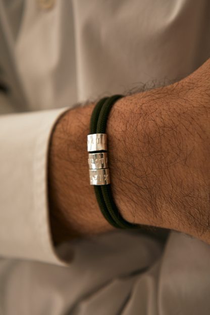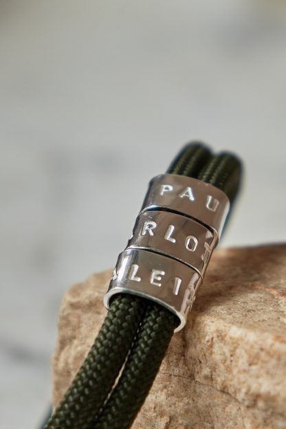 La pulsera cuerda marinera con 2 aros personalizados, es el regalo perfecto para él en el día del padre o para su aniversario. Va con un 2 aros personalizados que puedes grabar y combinarlos como más te guste: los 3 nombre de vuestros hijos, o 2 nombre y vuestras iniciales en el 3ro, o dos nombre y una fecha especial en el 3ro, etc. El grabado es manual con punzón que le da un aspecto muy artesanal y masculino a la vez. Los aritos y las terminales son de plata de ley 925 para que sea una pieza duradera y que perdure en el tiempo. Lleva una cuerda marinera con nudo corredizo ajustable. Además al ser de plata, la puede llevar cada día sin tener que quitársela para nada.