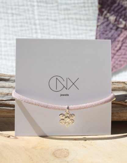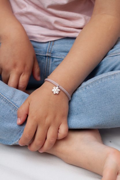 Pulsera elástica con colgante Flor personalizada para niña con una inicial en el reverso. Un diseño que hacemos en nuestro taller a través de una técnica artesanal, por eso tiene para esa textura única y un diseño muy original. Una pulsera apta para todas las edades ya que es perfecta para ir a conjunto con las más pequeñas de la casa. Puedes seleccionar entre diferentes tallas para asegurarte que aciertas con este regalo. Una joya muy cómoda de llevar que ni tú ni tus hijas os quitaréis.