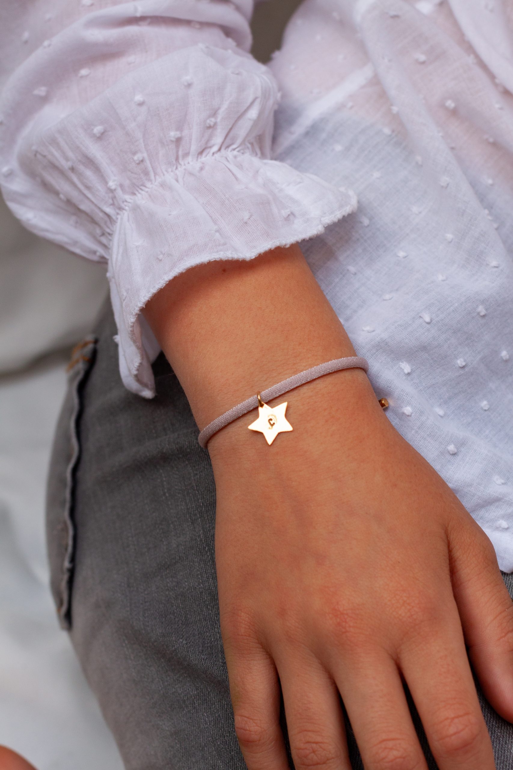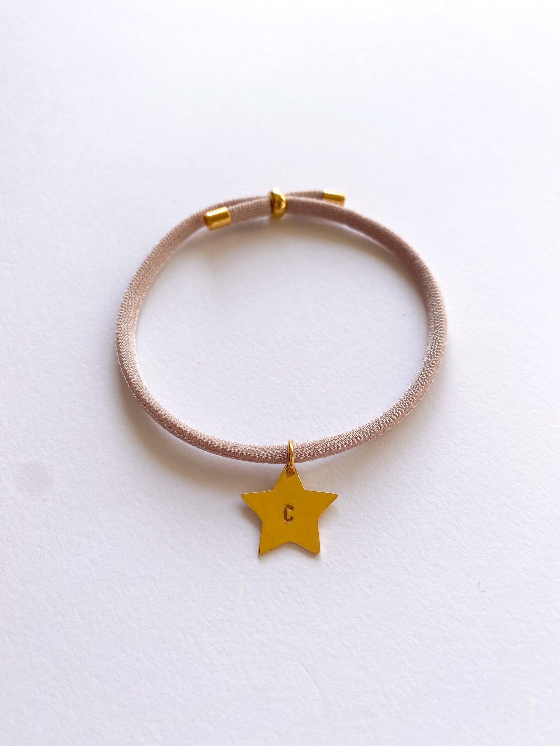 Pulsera con cinta elástica y con colgante en forma de estrella. Puedes personalizarla grabando la inicial que tú desees. Una pieza perfecta para nuestras pequeñas, ya que al tener la cinta elástica es muy cómoda de llevar y evita tirones secos. Y al ser de plata, la pueden llevar cada día sin tener que quitársela para nada. Es resistente al agua.