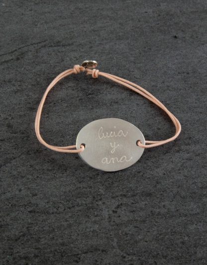 La pulsera Ovalada con Textura personalizada en el reverso. Una pulsera muy elegante y única que puedes personalizar con los nombres y fecha que tu desees.