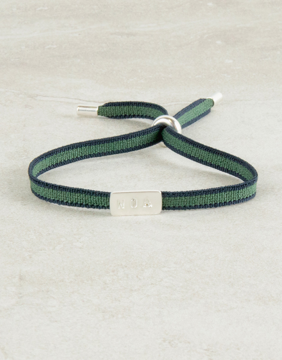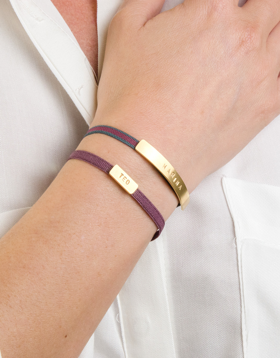 Pulsera con cinta elástica muy cómoda de atar y de llevar, con una placa personalizable con nombre corto. Un diseño muy minimal, elegante y chic.